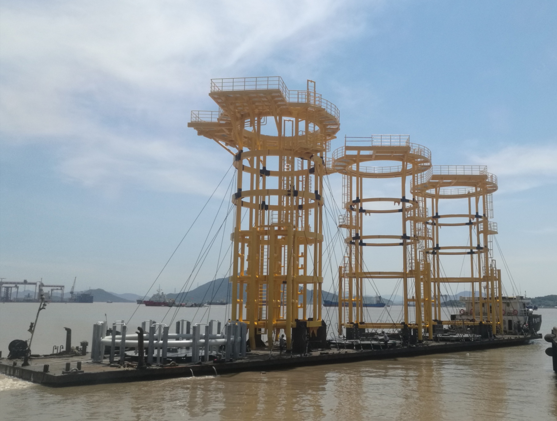 據介紹,風電套籠鋼結構是海上風電項目中風電管樁的一種保護裝置,風電套籠鋼結構主要由外平臺、內平臺、圈梁、靠泊附件、欄桿等組成。成品有兩種規格,一種總鋼量約為65噸,凈高18米;另一種總鋼量約為163噸,凈高20米。主要給船舶維修人員、工作人員進入海上深壓站提供平臺。