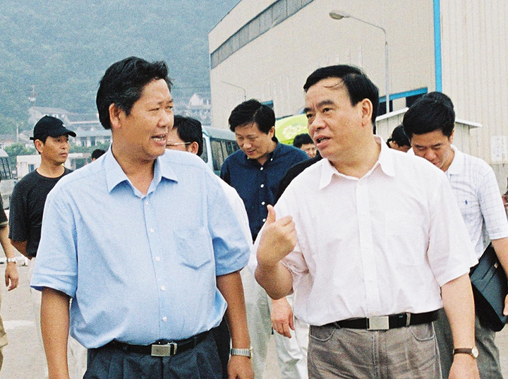 2003年8月8日,浙江省委副書記、省長呂祖善(右一)來“揚帆”視察,要求揚帆集團依托舟山的港口和區位優勢,拓展發展思路,創新管理機制,抓住船舶工業發展的有利機遇,進一步做大做強。